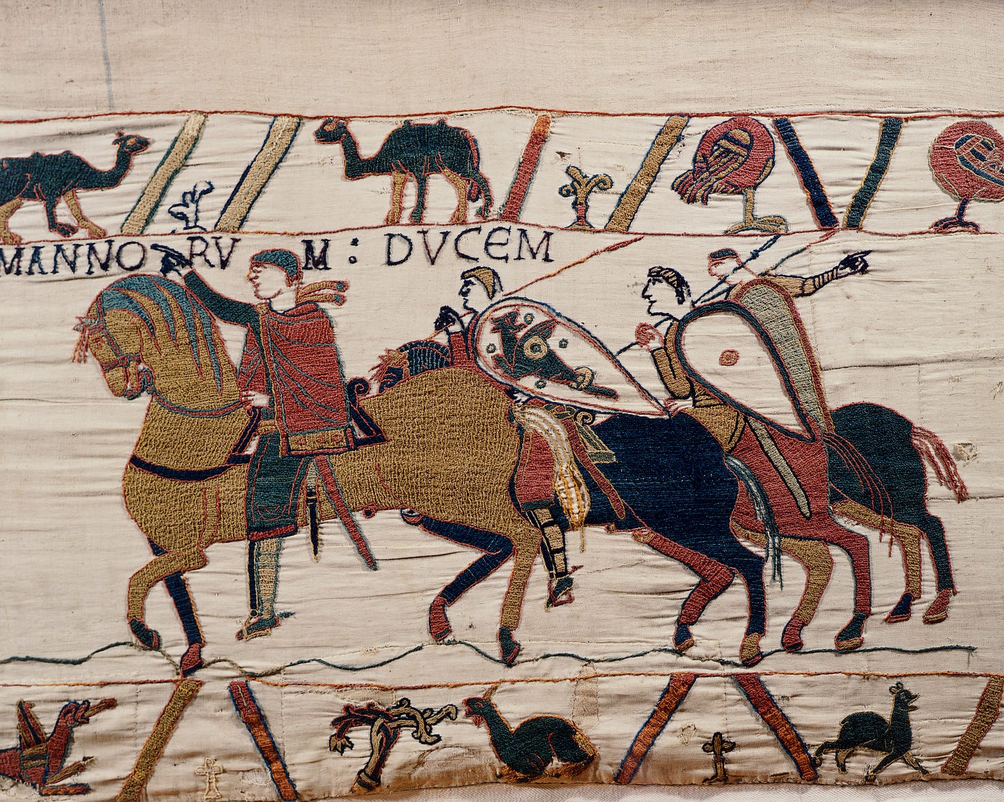 Harold’s facial hair in the Tapestry is in line with that of his Anglo-Saxon compatriots: they tend to (but don’t always) boast moustaches, some of which are thin and straggly, while others are impressive handlebar efforts. The Normans, on the other hand, lack upper lip action. The embroiderers were clearly following a style guide to try to offer a visual prompt to the viewer about which side the respective figures were on.